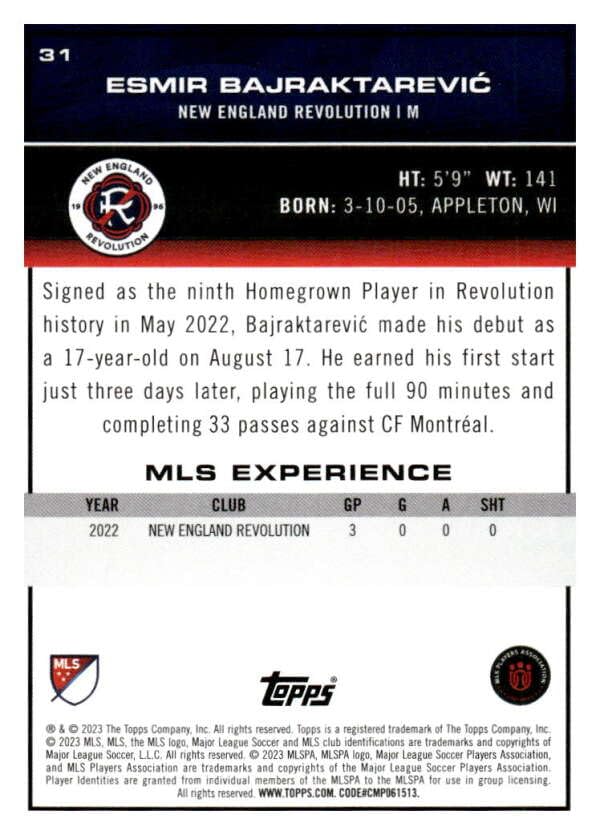 2023 TOPPS MAJOR LEAGUE SOCCER #31 ESMIR BAJRAKTAREVIC RC NEW ENGLAND REVOLUTION SOCCER OFFICIAL TRADING CARD OF SOCCER